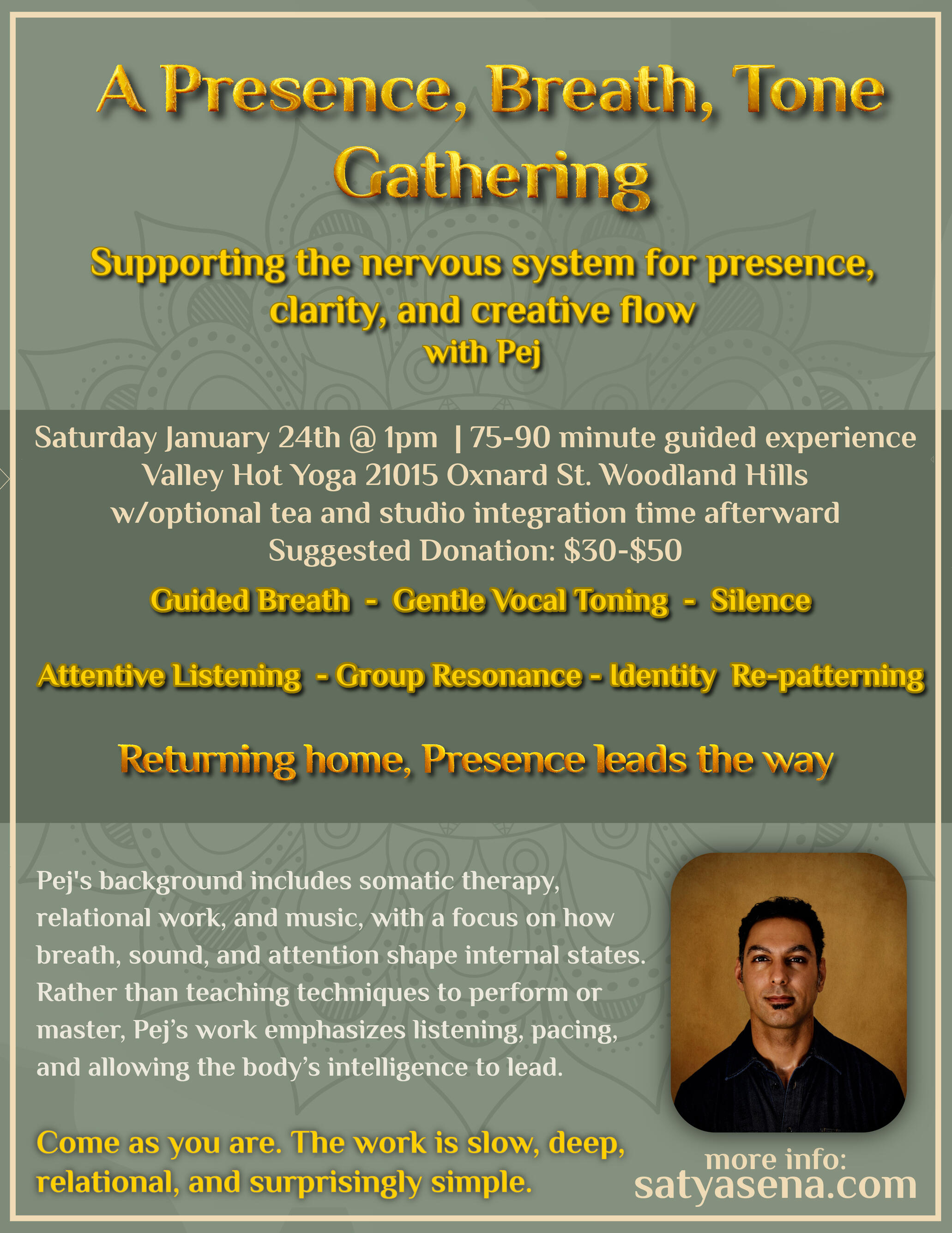 Description:The Presence, Breath, Tone series offers a grounded, body-based approach to stable presence β not as a concept, but as a lived state you can return to again and again, where regulation comes first, and creativity follows naturally.Through guided breath, gentle vocal toning, silence, and attentive listening, we work directly with the nervous system to settle reactivity and restore clarity. As the body stabilizes, presence becomes natural, and creativity, insight, and emotional regulation emerge on their own.What makes this different:This work is not about peak experiences, performance, or catharsis. Itβs about identifying the subtle patterns that keep the system in effort, and allowing them to unwind so presence becomes the baseline.Who This Is ForThis series is well-suited for people who are curious about meditation, creativity, or healing β and who want something practical, embodied, and sustainable.Each session builds on the last, gradually deepening stability, listening, and ease. No prior experience is required.